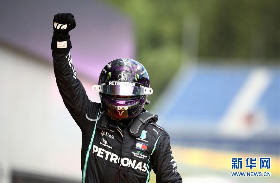 7月12日,汉密尔顿庆祝夺冠。 当日,在奥地利红牛赛道举行的2020赛季世界一级方程式锦标赛(F1)奥地利第二站比赛中,梅赛德斯车队车手汉密尔顿获得冠军。 新华社/路透