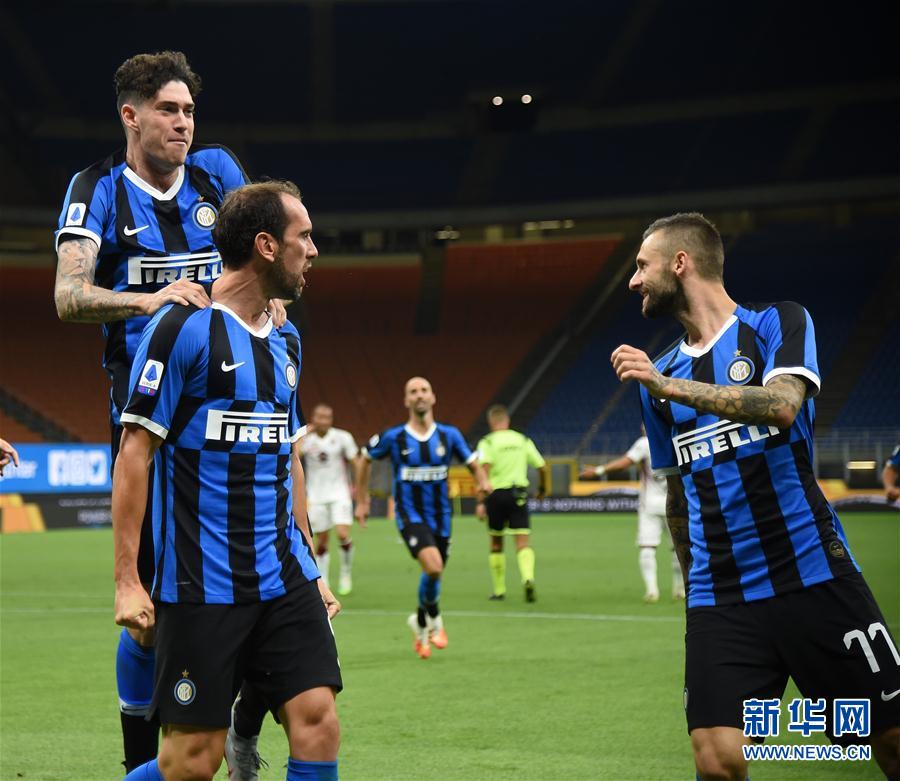 7月13日,国际米兰队球员戈丁(前左)在进球后和队友庆祝。 当日,在2019-2020赛季意大利足球甲级联赛第32轮比赛中,国际米兰队主场以3比1战胜都灵队。 新华社发(阿尔贝托·林格利亚摄)