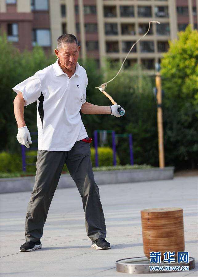 在长春市首山社区旁的一处广场,宽城区首山康健陀螺队的一名队员在抽陀螺(7月13日摄)。 每天下午,在长春市宽城区团山街道首山社区,宽城区首山康健陀螺队的队员们都会来到社区旁的一处广场玩陀螺。 队长孙树有和队友们将废旧木材和金属“变废为宝”,自制了许多不同样式的陀螺,小到5公斤,大到65公斤。 目前,这支社区陀螺队共有队员40余名,年龄最小的58岁,最大的80多岁,他们都将抽陀螺作为自己日常锻炼身体的方式。 “抽陀螺不仅可以增强肩颈和手臂力量,还能练到全身肌肉,玩起来特别过瘾。”孙树有说。 新华社发(颜麟蕴 摄)