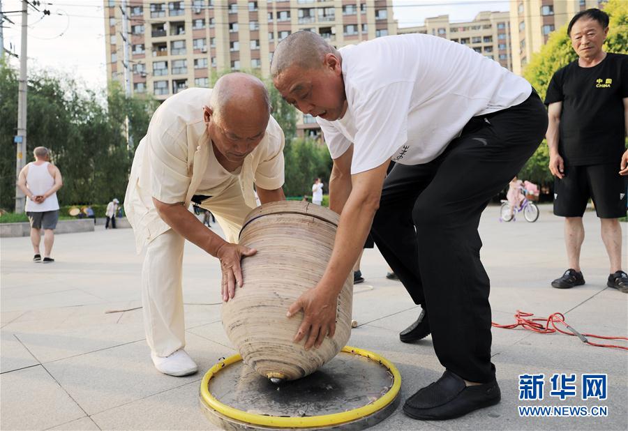 在长春市首山社区旁的一处广场,宽城区首山康健陀螺队的两名队员搬运一个重达65公斤的“超级陀螺”(7月13日摄)。 每天下午,在长春市宽城区团山街道首山社区,宽城区首山康健陀螺队的队员们都会来到社区旁的一处广场玩陀螺。 队长孙树有和队友们将废旧木材和金属“变废为宝”,自制了许多不同样式的陀螺,小到5公斤,大到65公斤。 目前,这支社区陀螺队共有队员40余名,年龄最小的58岁,最大的80多岁,他们都将抽陀螺作为自己日常锻炼身体的方式。 “抽陀螺不仅可以增强肩颈和手臂力量,还能练到全身肌肉,玩起来特别过瘾。”孙树有说。 新华社记者 雒圆 摄