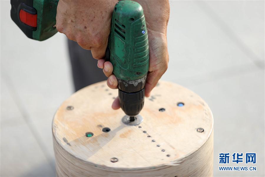 在长春市首山社区旁的一处广场,宽城区首山康健陀螺队一名队员用电钻发动一个重达65公斤的“超级陀螺”(7月13日摄)。 每天下午,在长春市宽城区团山街道首山社区,宽城区首山康健陀螺队的队员们都会来到社区旁的一处广场玩陀螺。 队长孙树有和队友们将废旧木材和金属“变废为宝”,自制了许多不同样式的陀螺,小到5公斤,大到65公斤。 目前,这支社区陀螺队共有队员40余名,年龄最小的58岁,最大的80多岁,他们都将抽陀螺作为自己日常锻炼身体的方式。 “抽陀螺不仅可以增强肩颈和手臂力量,还能练到全身肌肉,玩起来特别过瘾。”孙树有说。 新华社发(颜麟蕴 摄)