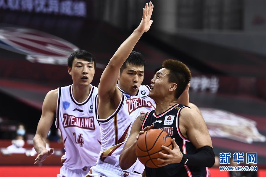 7月20日,广东东莞银行队球员赵睿(右)在比赛中突破。 当日,在山东青岛举行的2019-2020赛季中国男子篮球职业联赛(CBA)复赛第二阶段(崂山赛区)比赛中,广东东莞银行队以107比98战胜浙江稠州银行队。 新华社记者郭绪雷摄