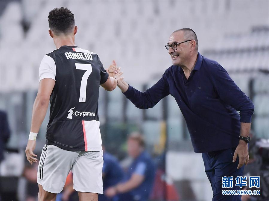 7月20日,尤文图斯队球员克里斯蒂亚诺·罗纳尔多(左)进球后与主帅萨里庆祝。 当日,在2019-2020赛季意大利足球甲级联赛第34轮比赛中,尤文图斯队主场以2比1战胜拉齐奥队。 新华社发(费德里科·塔尔迪托)