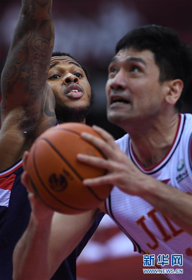 7月21日,时代中国广州队球员亨特(左)在比赛中防守吉林九台农商银行队球员钟诚上篮。 当日,在山东青岛举行的2019-2020赛季中国男子篮球职业联赛(CBA)复赛第二阶段(崂山赛区)比赛中,吉林九台农商银行队以98比95战胜时代中国广州队。 新华社记者李紫恒摄