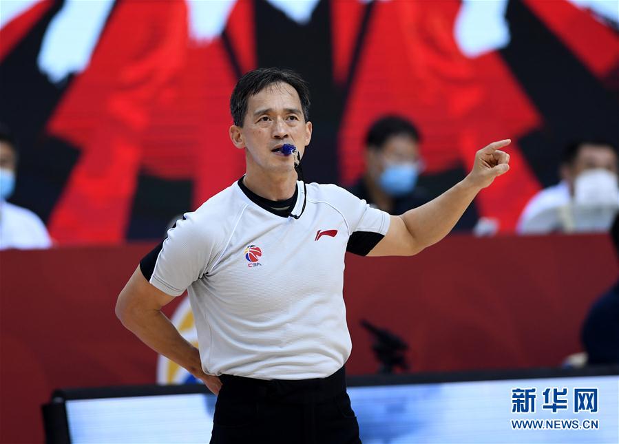 7月21日,主裁判胡吉在比赛中。 当日,在山东青岛举行的2019-2020赛季中国男子篮球职业联赛(CBA)复赛第二阶段(崂山赛区)比赛中,吉林九台农商银行队以98比95战胜时代中国广州队。 新华社记者李紫恒摄