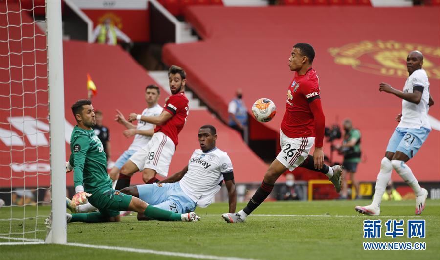 7月22日,曼联队球员格林伍德(前右二)在对方门前制造险情。 当日,在2019-2020赛季英格兰足球超级联赛第37轮比赛中,曼彻斯特联队主场以1比1战平西汉姆联队。 新华社/路透