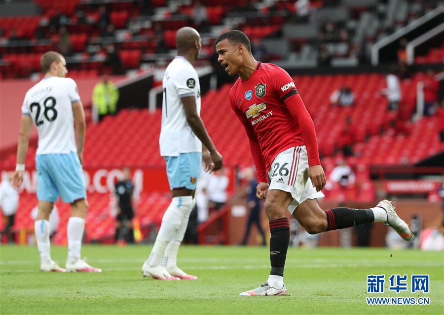 7月22日,曼联队球员格林伍德庆祝进球。 当日,在2019-2020赛季英格兰足球超级联赛第37轮比赛中,曼彻斯特联队主场以1比1战平西汉姆联队。 新华社/路透