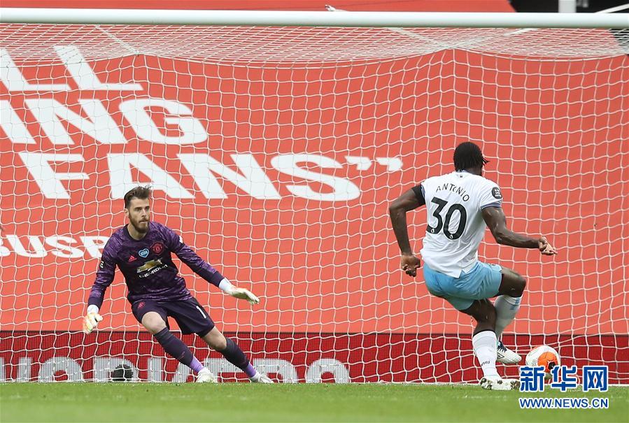 7月22日,西汉姆联队球员安东尼奥射门得分。 当日,在2019-2020赛季英格兰足球超级联赛第37轮比赛中,曼彻斯特联队主场以1比1战平西汉姆联队。 新华社/路透