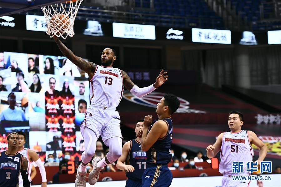7月23日,广东东莞银行队球员威姆斯(上)在比赛中上篮。 当日,在山东青岛举行的2019-2020赛季中国男子篮球职业联赛(CBA)复赛第二阶段(崂山赛区)比赛中,广东东莞银行队以131比106战胜南京同曦宙光队。 新华社记者郭绪雷摄