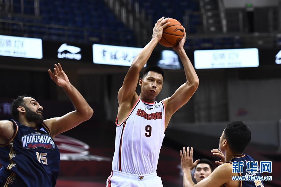 7月23日,广东东莞银行队球员易建联(中)在比赛中抢到篮板球。 当日,在山东青岛举行的2019-2020赛季中国男子篮球职业联赛(CBA)复赛第二阶段(崂山赛区)比赛中,广东东莞银行队以131比106战胜南京同曦宙光队。 新华社记者郭绪雷摄