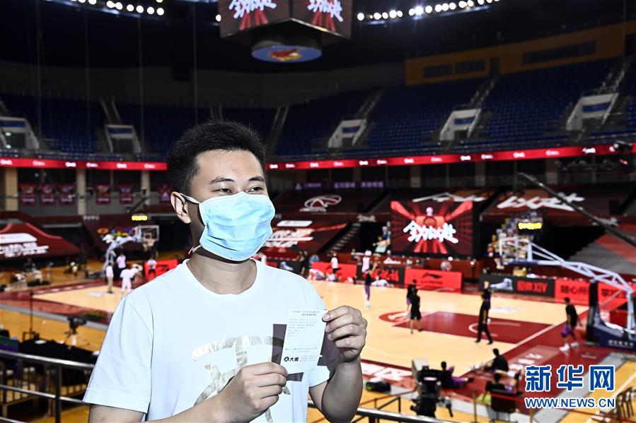 7月26日,在青岛国信体育馆,苏柯帆展示着自己的纸质球票。他成为CBA联赛复赛允许观众现场观赛后,首位进场的观众。 当日,在山东青岛举行的2019-2020赛季中国男子篮球职业联赛(CBA)复赛第二阶段(崂山赛区)比赛中,医护人员、教师、公安战线人士通过官方购票平台,完成包括核酸检测在内的相关流程后进场观看了上海久事队迎战山东西王队的比赛。 观赛期间,观赛者须全程佩戴口罩,对号入座,严格保持间隔一米就座。退场时,观众须按照自后向前、先两边后中间的顺序,保持“一米线”社交距离有序退场。 新华社记者 郭绪雷 摄