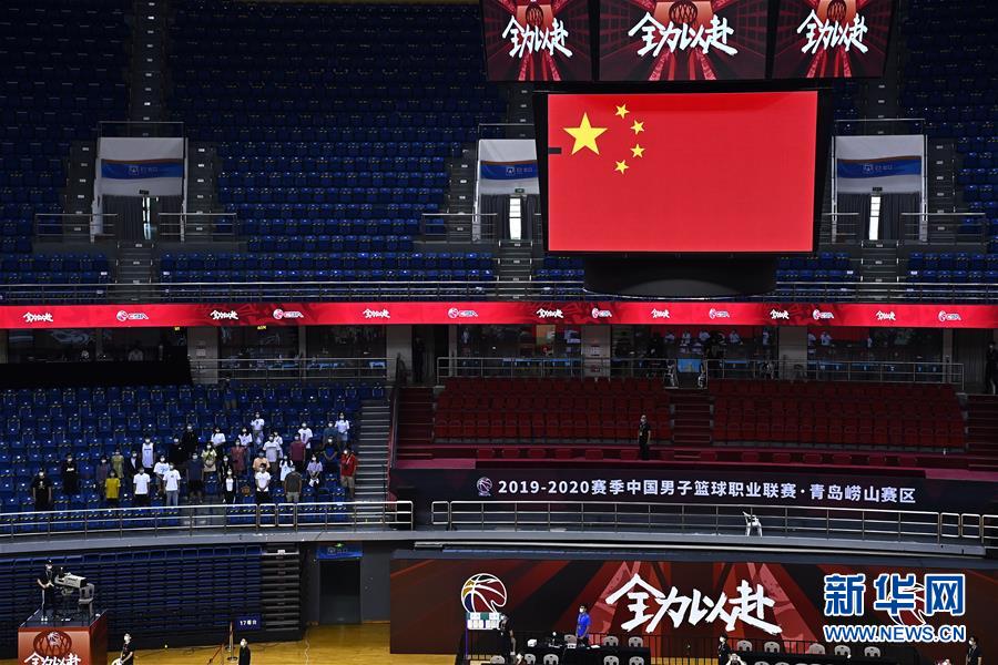 7月26日,这是上海久事队对阵山东西王队的比赛开赛前的升旗仪式。 当日,在山东青岛举行的2019-2020赛季中国男子篮球职业联赛(CBA)复赛第二阶段(崂山赛区)比赛中,医护人员、教师、公安战线人士通过官方购票平台,完成包括核酸检测在内的相关流程后进场观看了上海久事队迎战山东西王队的比赛。 观赛期间,观赛者须全程佩戴口罩,对号入座,严格保持间隔一米就座。退场时,观众须按照自后向前、先两边后中间的顺序,保持“一米线”社交距离有序退场。 新华社记者 郭绪雷 摄