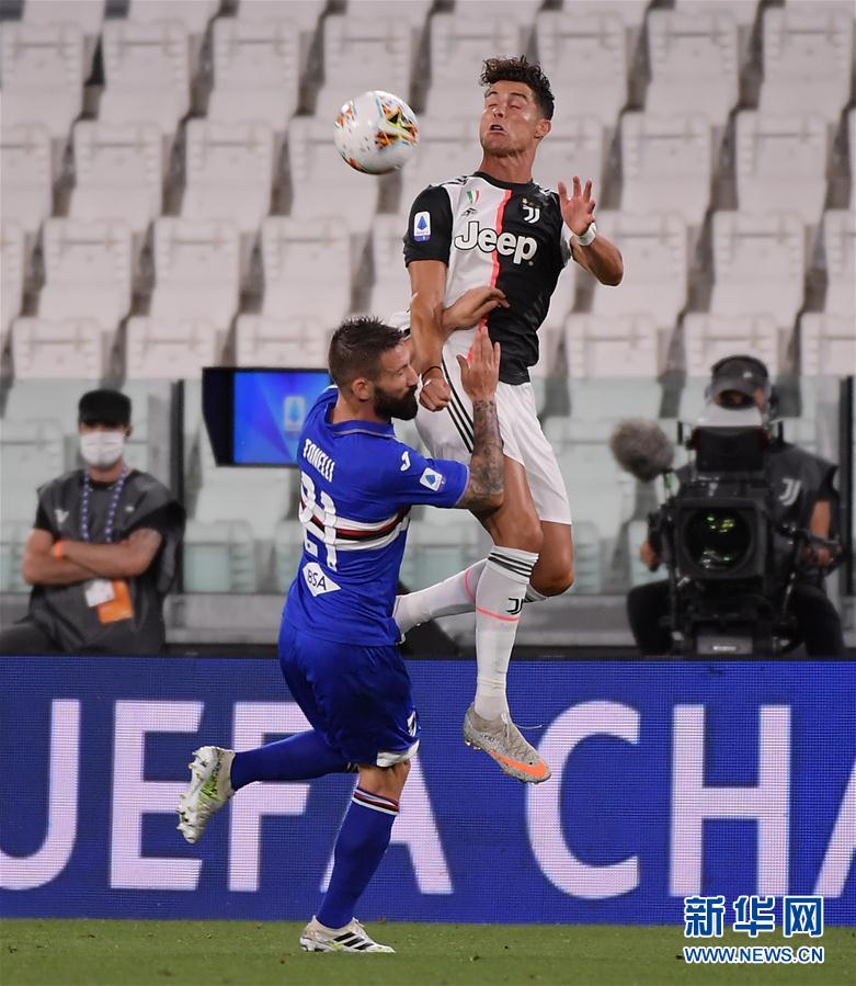 7月26日,尤文图斯队球员克·罗纳尔多(上)和桑普多利亚队球员托内利在比赛中争顶。 当日,在2019-2020赛季意大利足球甲级联赛第36轮比赛中,尤文图斯队主场以2比0战胜桑普多利亚队,提前两轮夺得本赛季意甲联赛冠军。 新华社发(费德里科·塔尔迪托摄)