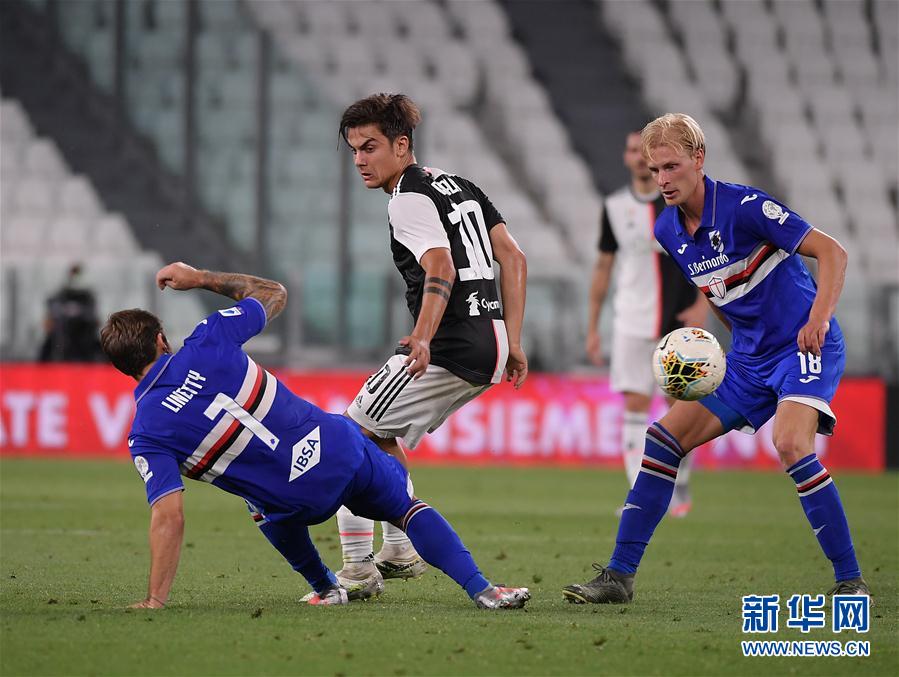 7月26日,尤文图斯队球员迪巴拉(中)和桑普多利亚队球员利内蒂(左)、托斯比在比赛中拼抢。 当日,在2019-2020赛季意大利足球甲级联赛第36轮比赛中,尤文图斯队主场以2比0战胜桑普多利亚队,提前两轮夺得本赛季意甲联赛冠军。 新华社发(费德里科·塔尔迪托摄)
