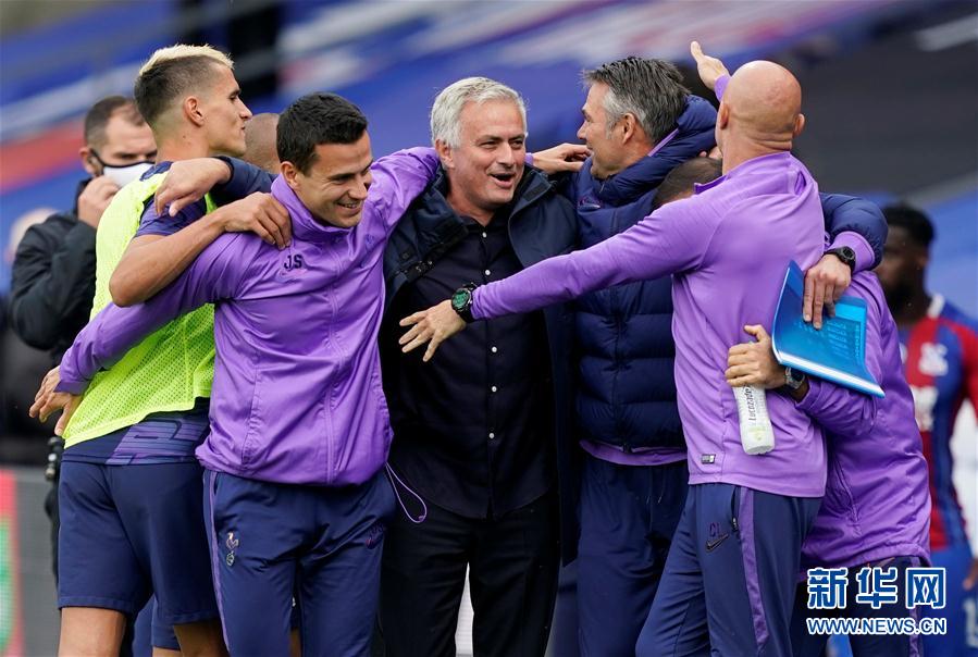 7月26日,热刺队主教练穆里尼奥(中)和球队工作人员在比赛后。 当日,在2019-2020赛季英格兰足球超级联赛第38轮比赛中,托特纳姆热刺队客场以1比1战平水晶宫队。 新华社/路透