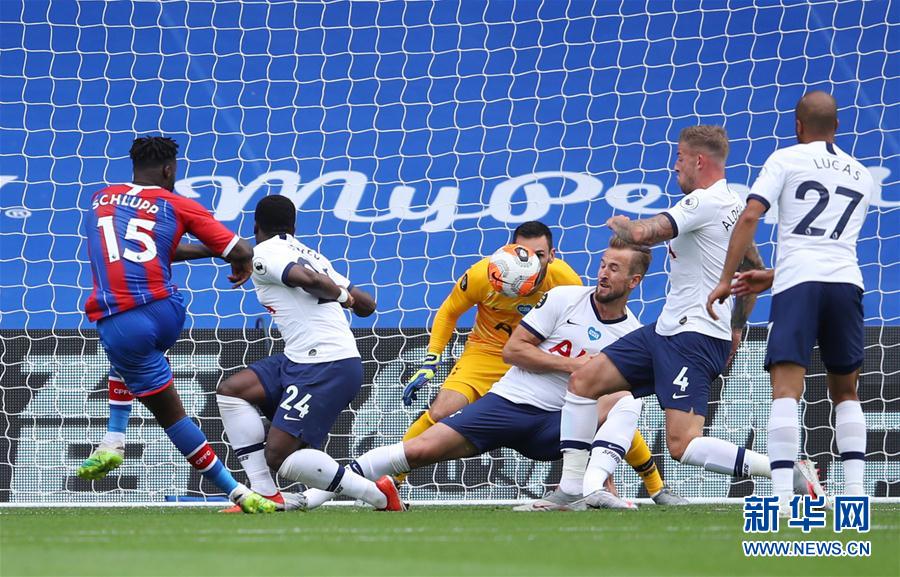 7月26日,水晶宫队球员施卢普(左一)在比赛中破门得分。 当日,在2019-2020赛季英格兰足球超级联赛第38轮比赛中,托特纳姆热刺队客场以1比1战平水晶宫队。 新华社/路透