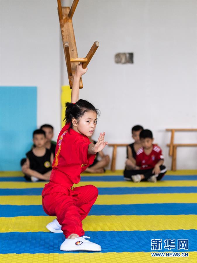 7月29日,学生滕艺扬在麻阳开扬文武学校练习苗家板凳拳。 湖南省怀化市麻阳苗族自治县有着悠久的习武传统。暑假期间,当地不少学生报名参加武术兴趣班,在强身健体的同时丰富假期生活。 新华社记者陈思汗摄