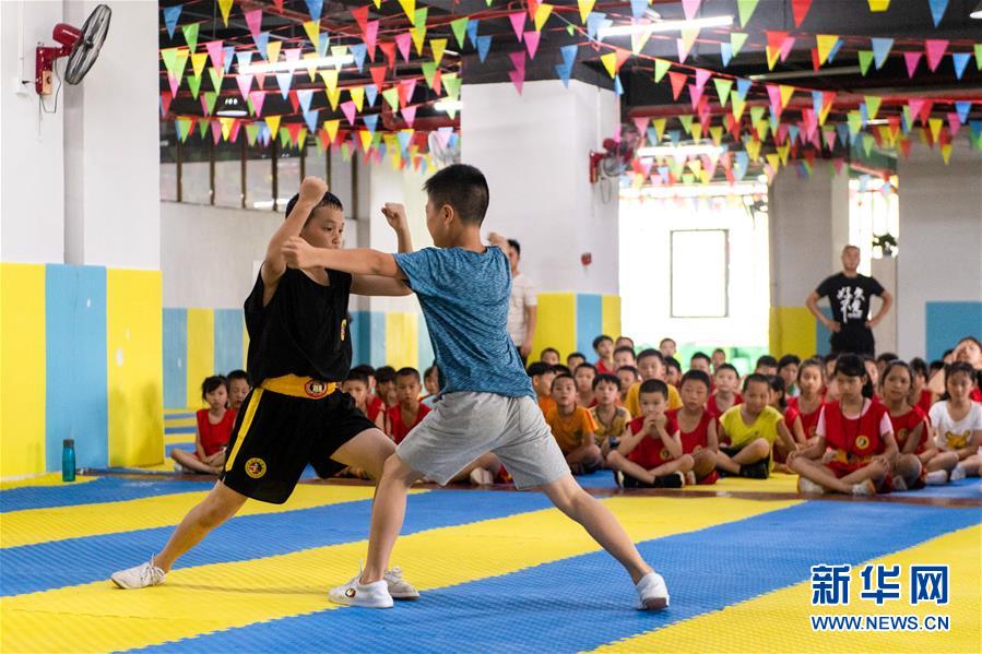 7月29日,学生王玉坤(前左)、刘伊玮(前右)在麻阳开扬文武学校切磋。 湖南省怀化市麻阳苗族自治县有着悠久的习武传统。暑假期间,当地不少学生报名参加武术兴趣班,在强身健体的同时丰富假期生活。 新华社记者周勉摄
