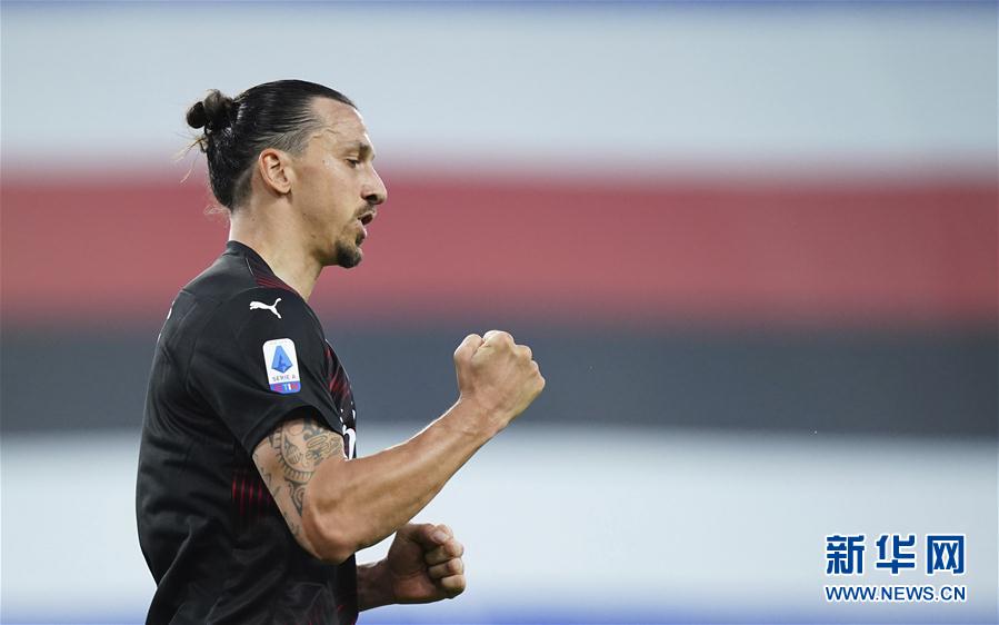 7月29日,AC米兰队球员伊布拉希莫维奇在打进球队第三粒进球后庆祝。 当日,在2019-2020赛季意大利足球甲级联赛第37轮比赛中,AC米兰队客场以4比1战胜桑普多利亚队。 新华社/美联