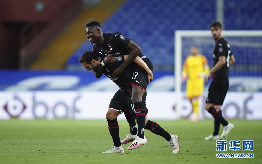 7月29日,AC米兰队球员恰尔汗奥卢(下)在打进球队第二粒进球后和队友莱奥庆祝。 当日,在2019-2020赛季意大利足球甲级联赛第37轮比赛中,AC米兰队客场以4比1战胜桑普多利亚队。 新华社/美联