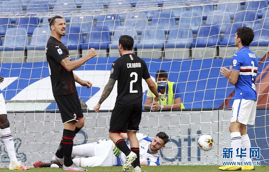 7月29日,AC米兰队球员伊布拉希莫维奇(左)在打进球队第一粒进球后庆祝。 当日,在2019-2020赛季意大利足球甲级联赛第37轮比赛中,AC米兰队客场以4比1战胜桑普多利亚队。 新华社/美联