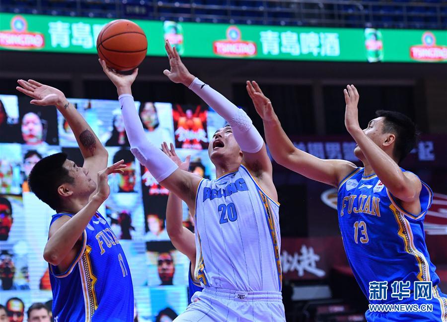8月2日,北京首钢队球员翟晓川(中)在比赛中突破上篮。 当日,在山东青岛举行的2019-2020赛季中国男子篮球职业联赛(CBA)季后赛四分之一决赛中,北京首钢队以107比75战胜福建豹发力队,晋级四强。 新华社记者 朱峥 摄