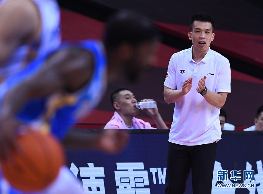8月2日,北京首钢队代理主教练解立彬在场边指挥。 当日,在山东青岛举行的2019-2020赛季中国男子篮球职业联赛(CBA)季后赛四分之一决赛中,北京首钢队以107比75战胜福建豹发力队,晋级四强。 新华社记者 朱峥 摄