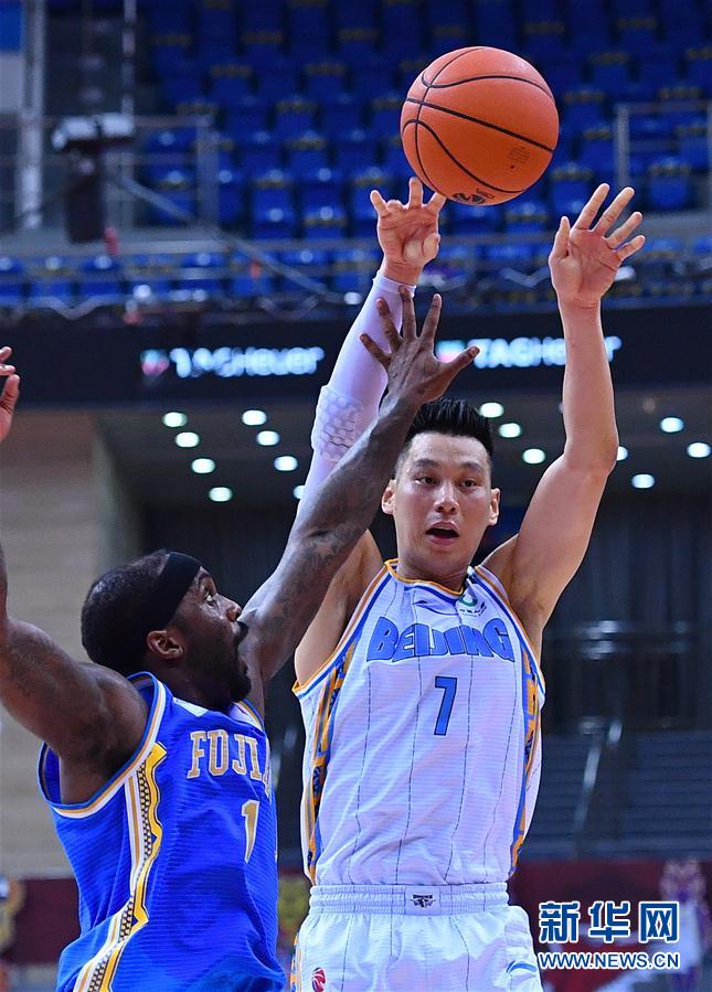 8月2日,北京首钢队球员林书豪(右)在比赛中传球。 当日,在山东青岛举行的2019-2020赛季中国男子篮球职业联赛(CBA)季后赛四分之一决赛中,北京首钢队以107比75战胜福建豹发力队,晋级四强。 新华社记者 朱峥 摄
