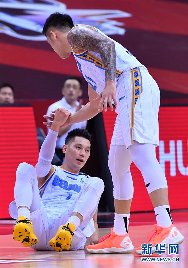 8月2日,北京首钢队球员周仪翔(右)拉起倒地的队友林书豪。 当日,在山东青岛举行的2019-2020赛季中国男子篮球职业联赛(CBA)季后赛四分之一决赛中,北京首钢队以107比75战胜福建豹发力队,晋级四强。 新华社记者 朱峥 摄