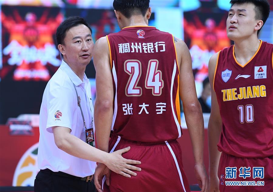 8月3日,浙江稠州银行队主教练刘维伟(左)鼓励队员。 当日,在山东青岛举行的2019-2020赛季中国男子篮球职业联赛(CBA)季后赛四分之一决赛中,辽宁本钢队对阵浙江稠州银行队。 新华社记者朱峥摄