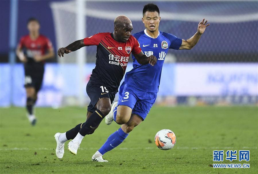 8月10日,河南建业队球员张文涛(右)与深圳佳兆业队球员比福马在比赛中拼抢。 当日,在2020赛季中国足球协会超级联赛第一阶段(大连赛区)第四轮比赛中,河南建业队以2比1战胜深圳佳兆业队。 新华社记者 龙雷 摄