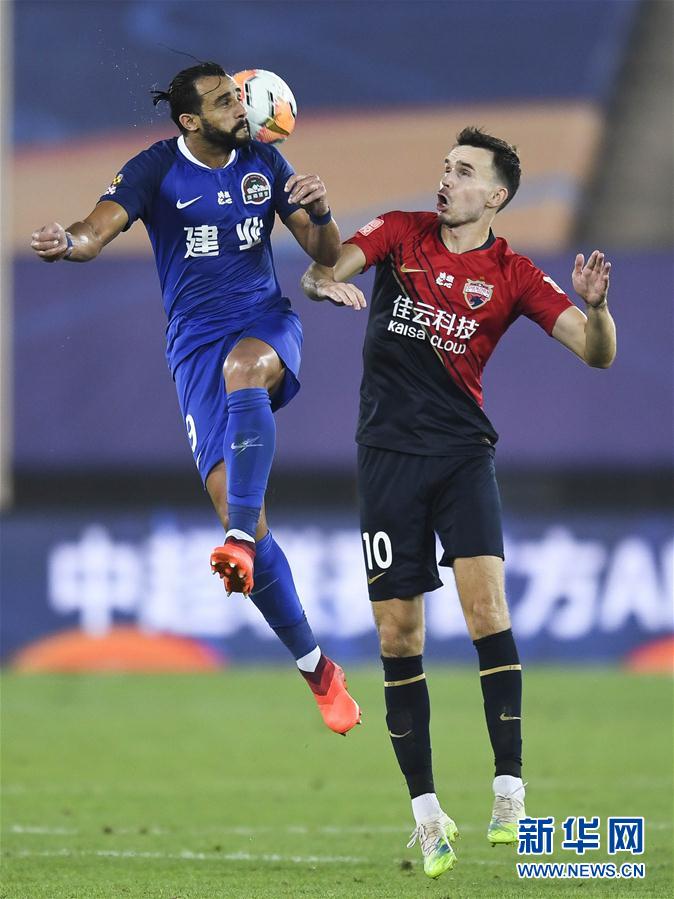 8月10日,河南建业队球员多拉多(左)与深圳佳兆业队球员塞尔纳斯在比赛中争顶。 当日,在2020赛季中国足球协会超级联赛第一阶段(大连赛区)第四轮比赛中,河南建业队以2比1战胜深圳佳兆业队。 新华社记者 龙雷 摄