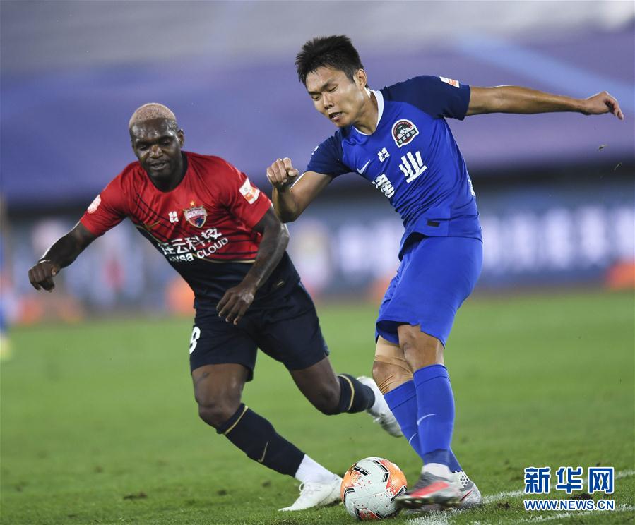 8月10日,河南建业队球员王上源(右)与深圳佳兆业队球员比福马在比赛中拼抢。 当日,在2020赛季中国足球协会超级联赛第一阶段(大连赛区)第四轮比赛中,河南建业队以2比1战胜深圳佳兆业队。 新华社记者 龙雷 摄