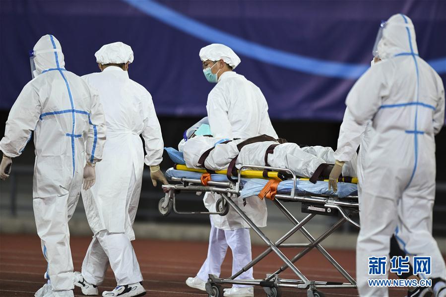 8月10日,在比赛中受伤的深圳佳兆业队球员马里穿上防护服后被医护人员带离球场。 当日,在2020赛季中国足球协会超级联赛第一阶段(大连赛区)第四轮比赛中,深圳佳兆业队以1比2不敌河南建业队。 新华社记者 龙雷 摄