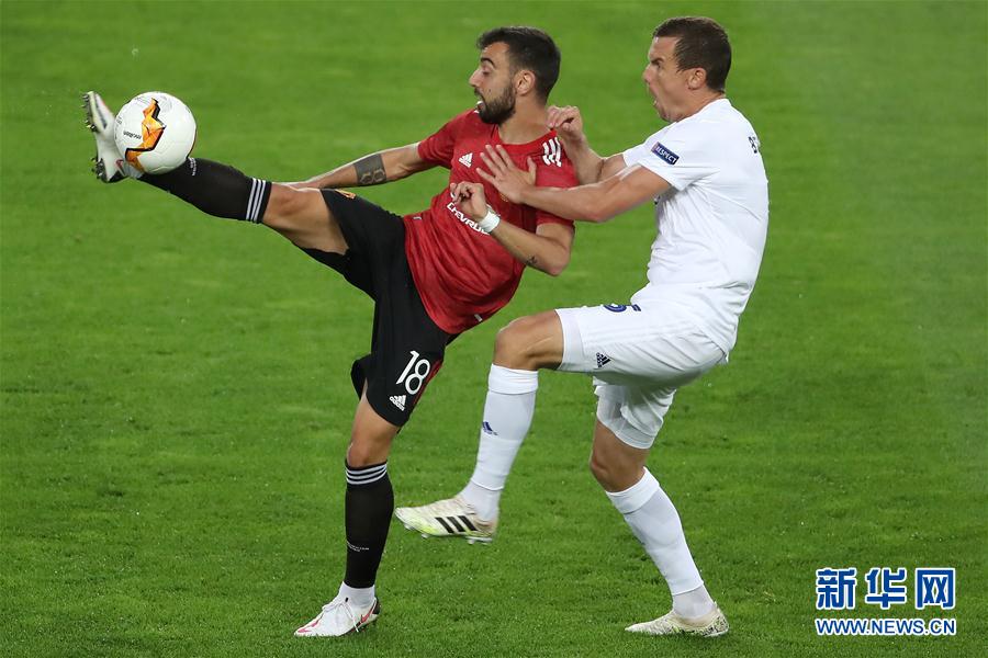 8月10日,曼联队球员费尔南德斯(左)在比赛中与哥本哈根队球员比耶兰拼抢。 当日,在德国科隆进行的2019-2020赛季欧罗巴联赛四分之一决赛中,英超曼彻斯特联队以1比0战胜丹超哥本哈根队,晋级半决赛。 新华社发(欧洲足联供图)