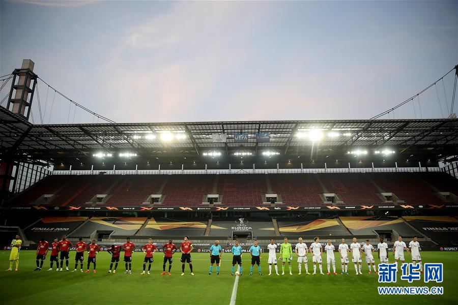 8月10日,双方球员在比赛前列队。受新冠肺炎疫情影响,本场比赛空场进行。 当日,在德国科隆进行的2019-2020赛季欧罗巴联赛四分之一决赛中,英超曼彻斯特联队以1比0战胜丹超哥本哈根队,晋级半决赛。 新华社发(欧洲足联供图)