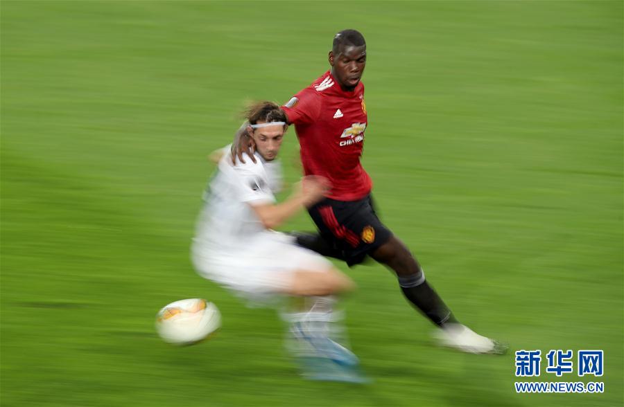 8月10日,曼联队球员博格巴(右)在比赛中与哥本哈根队球员法尔克拼抢。 当日,在德国科隆进行的2019-2020赛季欧罗巴联赛四分之一决赛中,英超曼彻斯特联队以1比0战胜丹超哥本哈根队,晋级半决赛。 新华社发(欧洲足联供图)