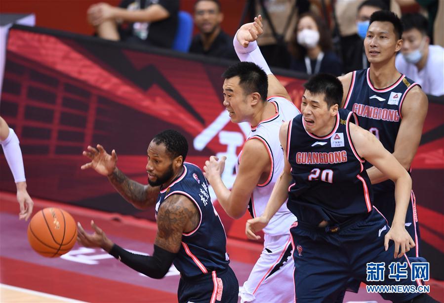 8月13日,辽宁本钢队球员韩德君(左二)与广东东莞银行队球员威姆斯(左一)、任骏飞(右二)、易建联(右一)在比赛中拼抢。 当日,在山东青岛举行的2019-2020赛季中国男子篮球职业联赛(CBA)总决赛第二场比赛中,辽宁本钢队以115比113战胜广东东莞银行队。目前,双方以1比1的总比分战平。 新华社记者 李紫恒 摄
