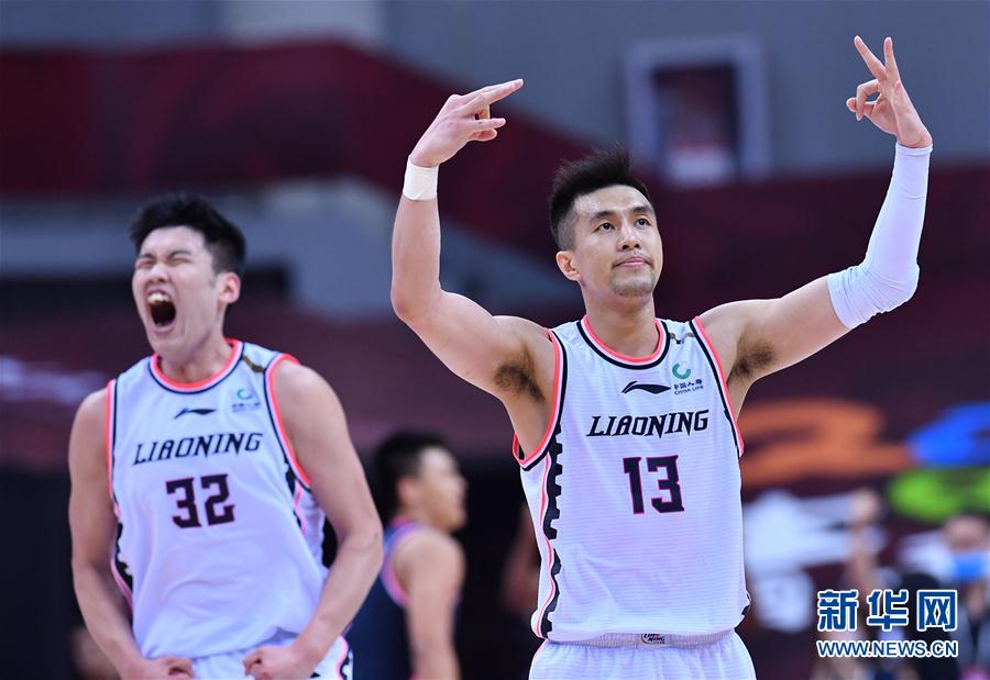 8月13日,辽宁本钢队球员郭艾伦(右)庆祝得分。 当日,在山东青岛举行的2019-2020赛季中国男子篮球职业联赛(CBA)总决赛第二场比赛中,辽宁本钢队以115比113战胜广东东莞银行队。目前,双方以1比1的总比分战平。 新华社记者朱峥摄