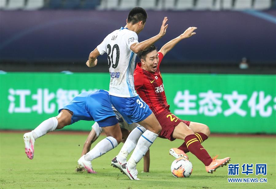 8月17日,河北华夏幸福队球员任航(右)在禁区造成对方犯规为球队赢得点球。 当日,在2020赛季中国足球协会超级联赛第一阶段(苏州赛区)第五轮比赛中,河北华夏幸福队对阵天津泰达队。 新华社记者杨磊摄