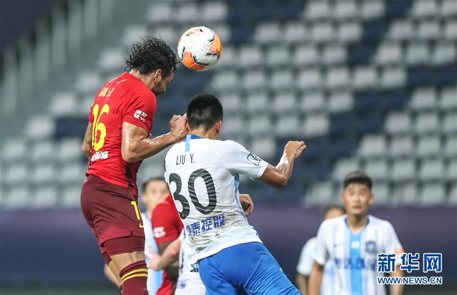8月17日,河北华夏幸福队球员高拉特(左)在比赛中头球破门。 当日,在2020赛季中国足球协会超级联赛第一阶段(苏州赛区)第五轮比赛中,河北华夏幸福队对阵天津泰达队。 新华社记者杨磊摄