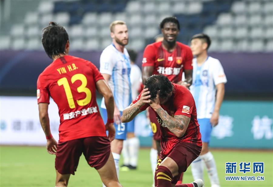8月17日,河北华夏幸福队球员高拉特(右)在比赛中头球破门后受伤。 当日,在2020赛季中国足球协会超级联赛第一阶段(苏州赛区)第五轮比赛中,河北华夏幸福队对阵天津泰达队。 新华社记者杨磊摄