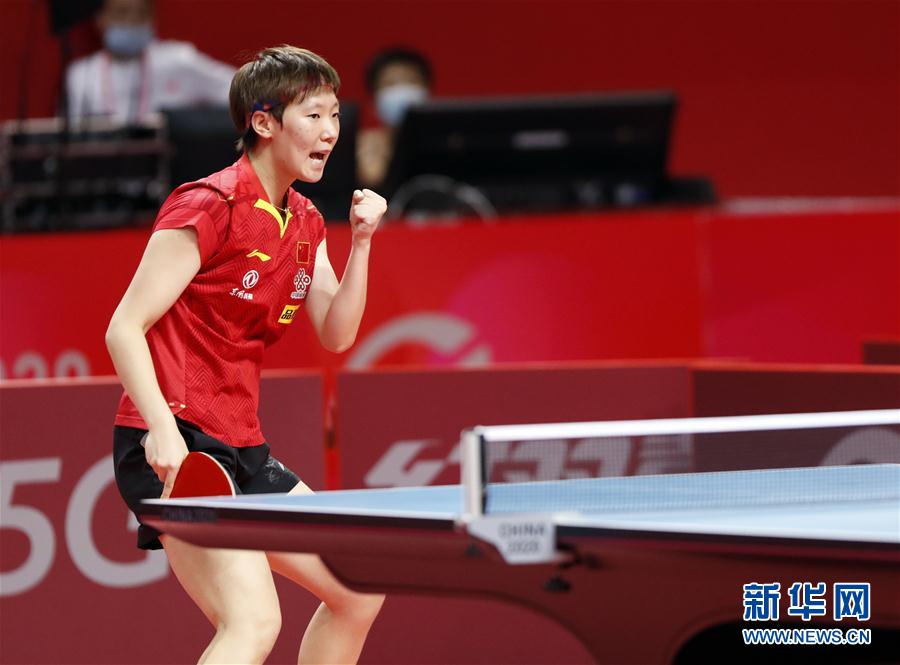 8月20日,王曼昱在比赛中庆祝得分,她以3比0战胜陈幸同。 当日,在海南陵水举行的中国乒乓球队奥运模拟赛女子团体决赛中,由陈梦、孙颖莎和王曼昱组成的女子一团以3比0战胜由顾玉婷、陈幸同和孙铭阳组成的女子二团,获得冠军。 新华社发(边玉翔摄)