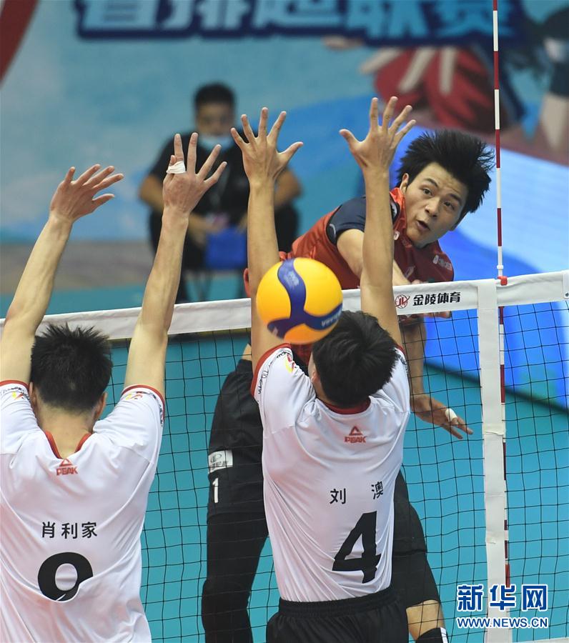 8月24日,天津食品集团队球员罗壮(上)在比赛中扣球。 当日,在河北省秦皇岛进行的2019-2020赛季中国男子排球超级联赛第二阶段G组比赛中,天津食品集团队以3比0战胜辽宁队。 新华社记者 朱旭东 摄