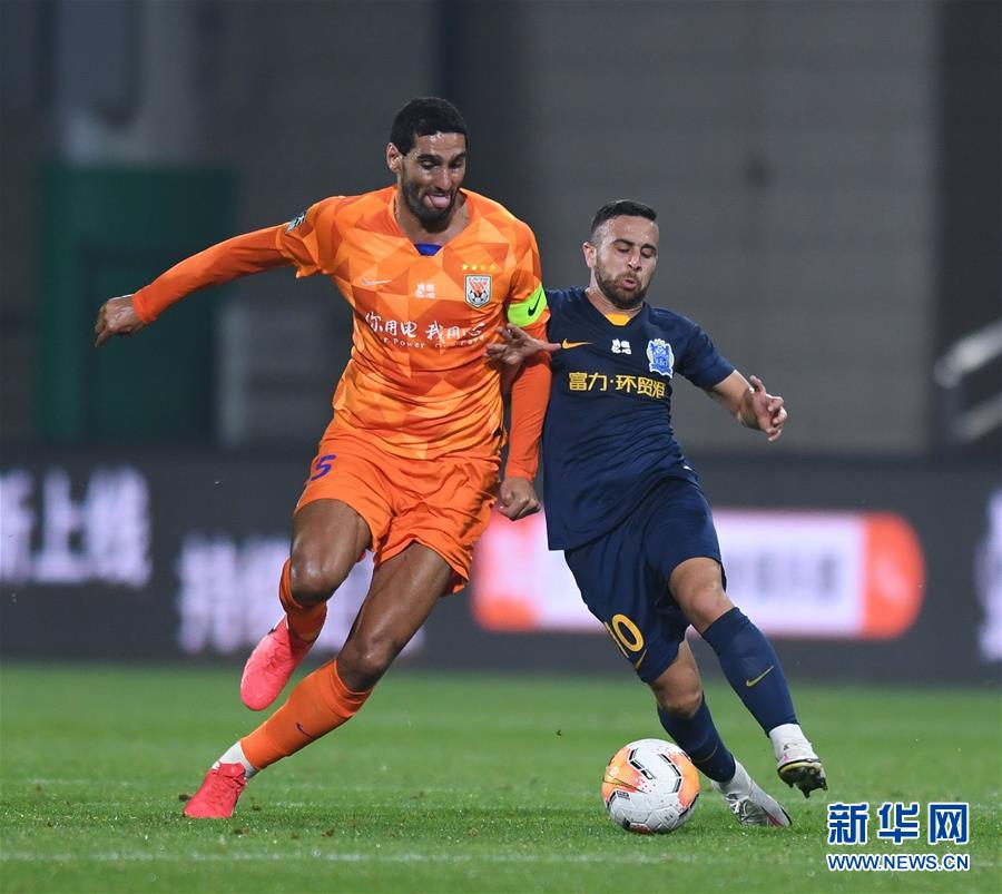 8月25日,山东鲁能泰山队球员费莱尼(左)在比赛中与广州富力队球员萨巴拼抢。 当日,在2020赛季中国足球协会超级联赛第一阶段(大连赛区)第七轮比赛中,山东鲁能泰山队以5比1战胜广州富力队。 新华社记者龙雷摄