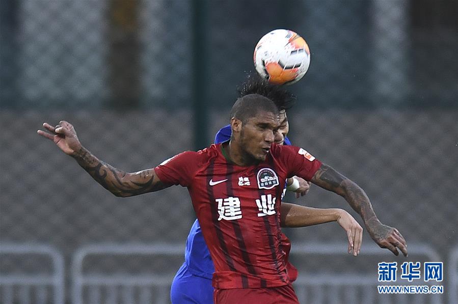 8月26日,河南建业队球员卡兰加(前)在比赛中与上海绿地申花队球员毕津浩争顶。 当日,在2020赛季中国足球协会超级联赛第一阶段(大连赛区)第七轮比赛中,河南建业队以0比0战平上海绿地申花队。 新华社记者 龙雷 摄