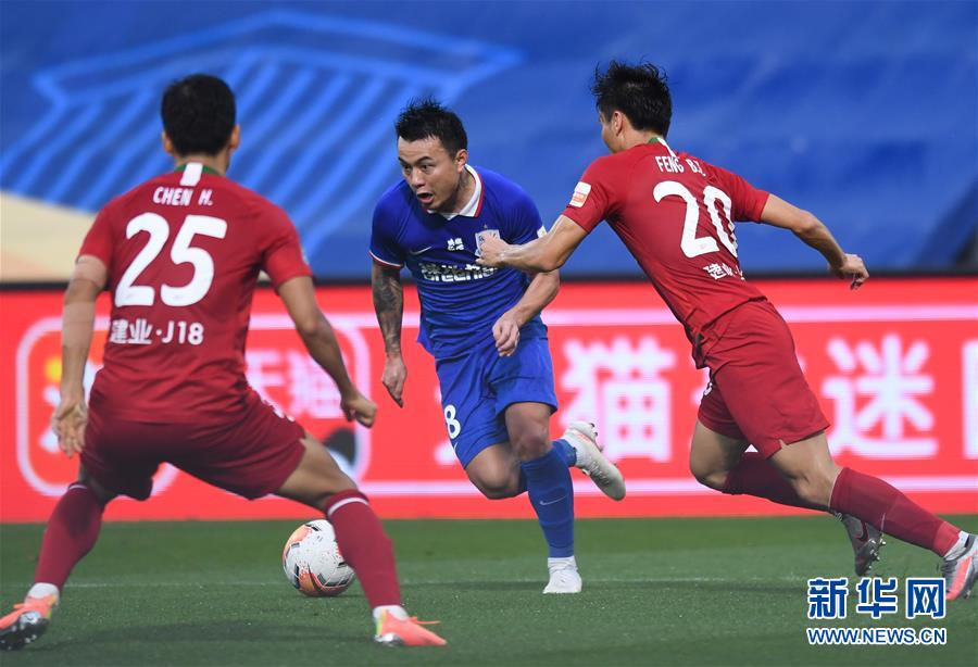 8月26日,上海绿地申花队球员曹赟定(中)在比赛中带球进攻。 当日,在2020赛季中国足球协会超级联赛第一阶段(大连赛区)第七轮比赛中,河南建业队以0比0战平上海绿地申花队。 新华社记者 龙雷 摄