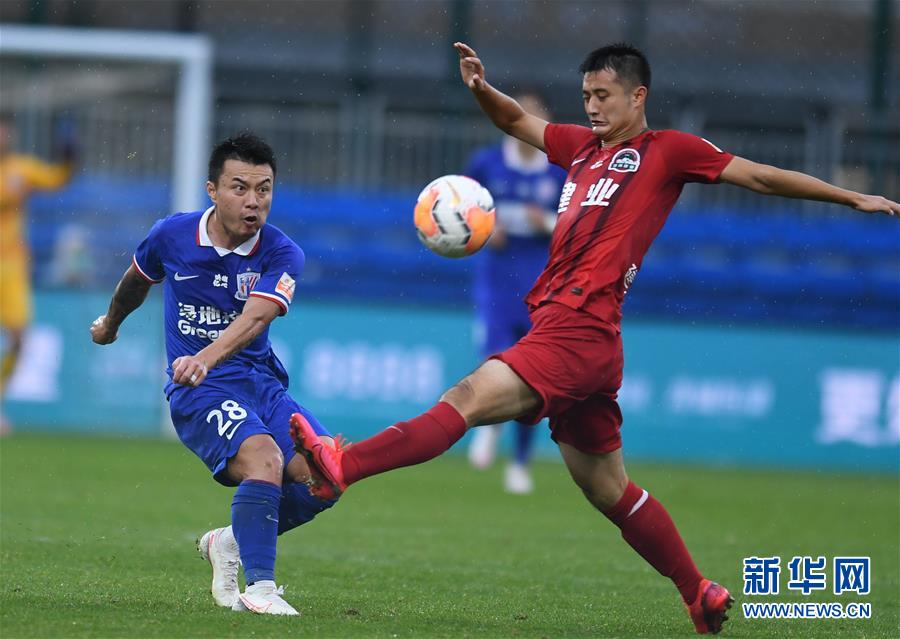 8月26日,上海绿地申花队球员曹赟定(左)在比赛中传球。 当日,在2020赛季中国足球协会超级联赛第一阶段(大连赛区)第七轮比赛中,河南建业队以0比0战平上海绿地申花队。 新华社记者 龙雷 摄