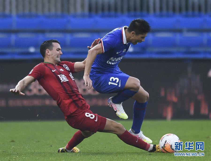 8月26日,河南建业队球员周定洋(左)在比赛中防守上海绿地申花队球员赵明剑。 当日,在2020赛季中国足球协会超级联赛第一阶段(大连赛区)第七轮比赛中,河南建业队以0比0战平上海绿地申花队。 新华社记者 龙雷 摄