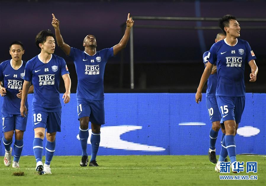 8月27日,石家庄永昌队球员穆里奇(左三)庆祝进球。 当日,在2020赛季中国足球协会超级联赛第一阶段(苏州赛区)第七轮比赛中,石家庄永昌队以2比2战平北京中赫国安队。 新华社记者韩瑜庆摄